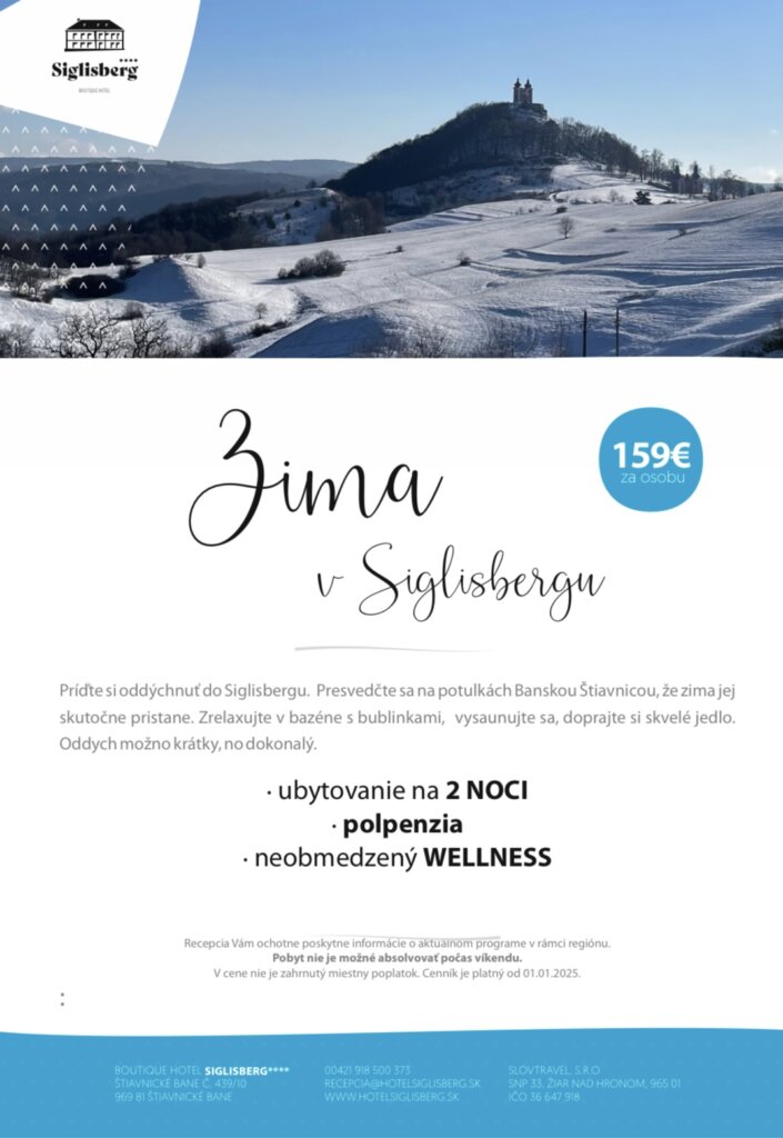 Príďte si oddýchnuť do Siglisbergu. Presvedčte sa na potulkách Banskou Štiavnicou, že zima jej skutočne pristane. Zrelaxujte v bazéne s bublinkami, vysaunujte sa, doprajte si skvelé jedlo. Oddych možno krátky, no dokonalý.